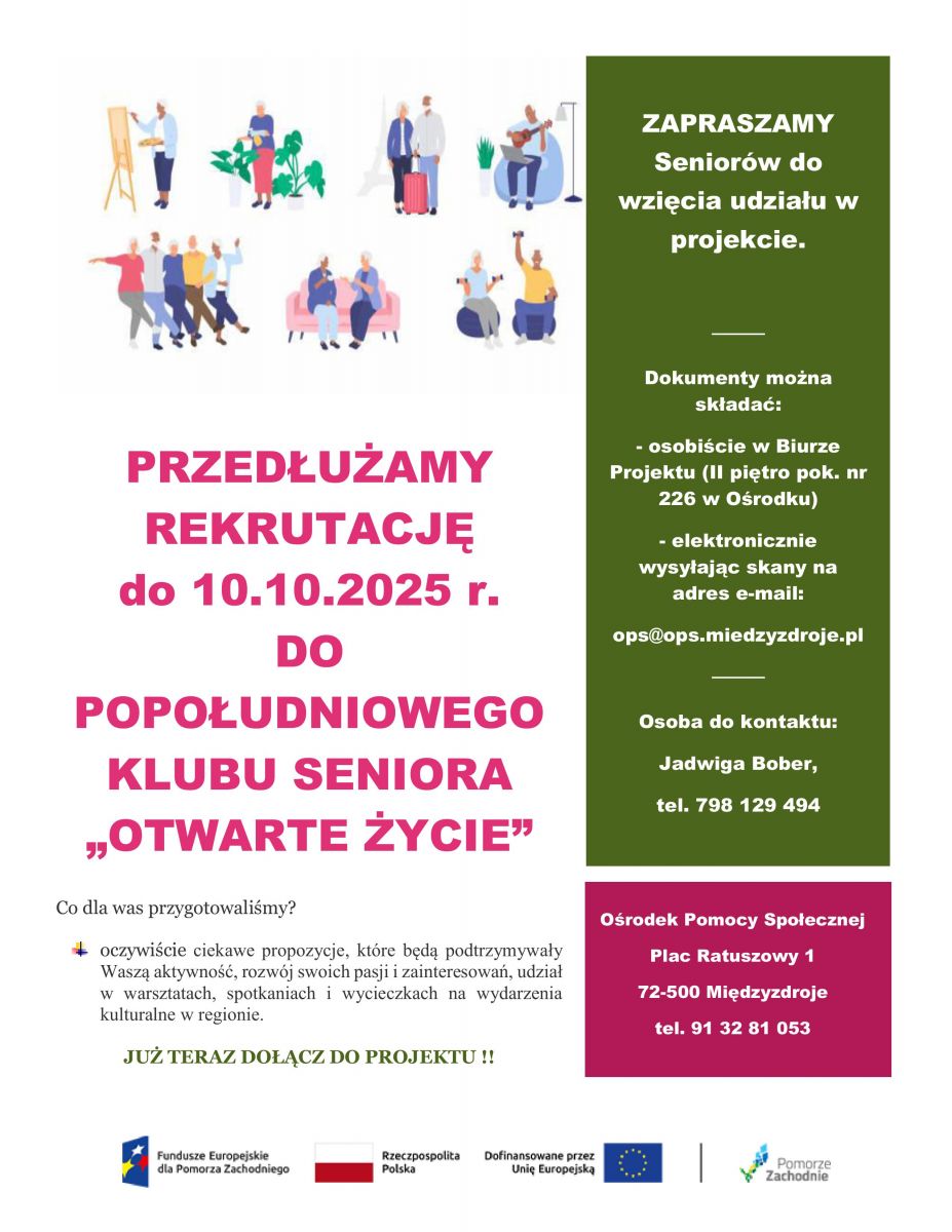 Zapraszamy Seniorów z Gminy Międzyzdroje do udziału w Popołudniowym Klubie Seniora „Otwarte Życie”, który będzie się mieścił w budynku pn. Centrum Integracji Społecznej przy ulicy Kolejowej 33 w Międzyzdrojach.